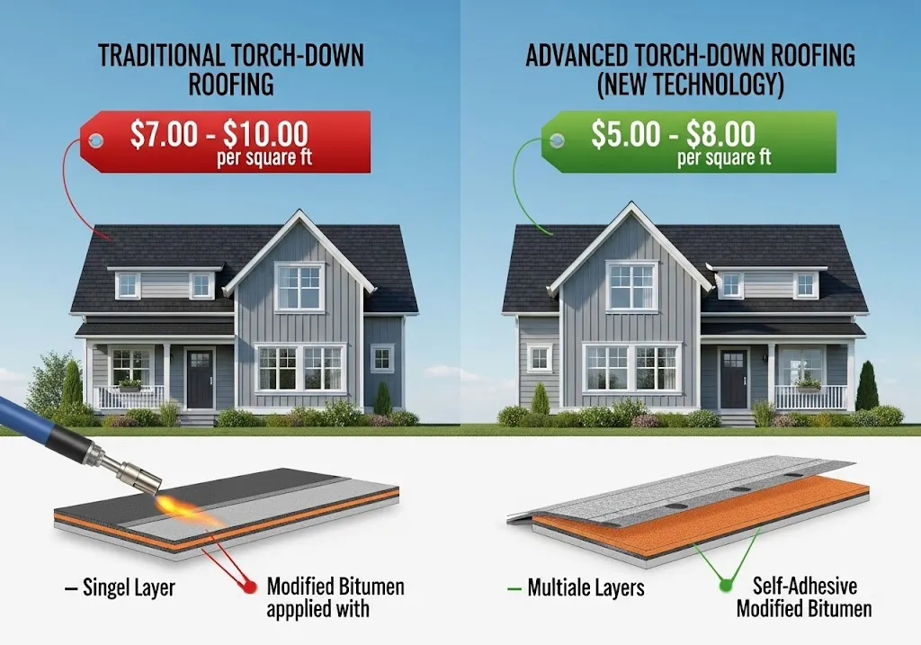The cost to install torch down roofing typically ranges from $3 to $8 per square foot for materials and labor combined. Two-layer systems fall on the lower end of this range, while three-layer torch down roof systems command higher prices due to additional materials and labor requirements.